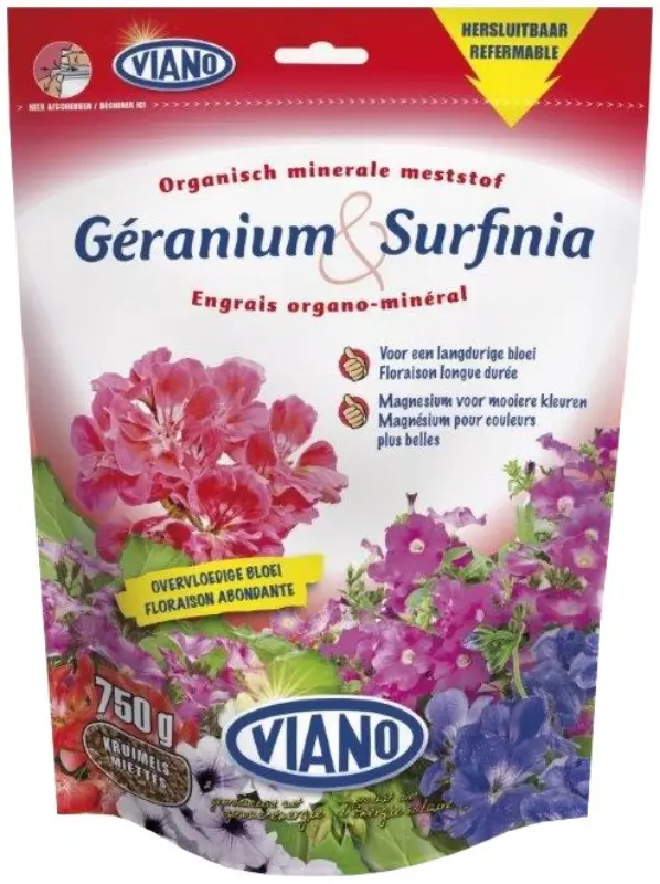 Komplex szerves ásványi növénytáp magnéziummal, geranium fajták (gólyaorr) virágok részére. Ajánlott ültetőközeg keveréséhez 3-5L/m3 talaj arányban. Magas kálium tartalma intenzív virágzást eredményez. Növeli a talaj humusz tartalmát, javítja a szerkezetét. A növénytápot minden virágzási periódust követően javasolt használni a növény erőteljes fejlődése érdekében. A kijuttatott tápot keverjük össze a talajjal és öntözzük be. A termék hosszú hatású, a tápanyag leadása 100 napon át garantált.