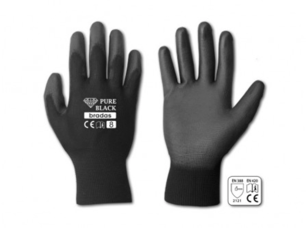 RWPBC10PURE BLACK poliuretán védőkesztyű, 10-es méretPoliuretán (PU) bevonatú kesztyű.Kötött poliészterből készült – 13-as öltésVágásnak és szakadásnak ellenáll.Tökéletes precíz kézi munkához.