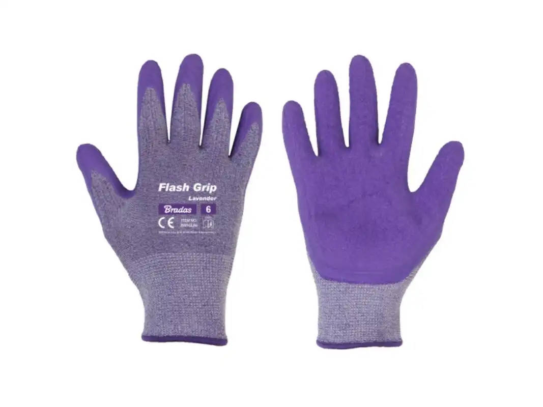 RWFGLR8 FLASH GRIP LAVENDER védőkesztyű, 8-as méret latex Kötött poliészterből és spandexből készült kesztyű – 13. öltés Ujjak hab latex bevonattal. Vágás- és szakadásálló