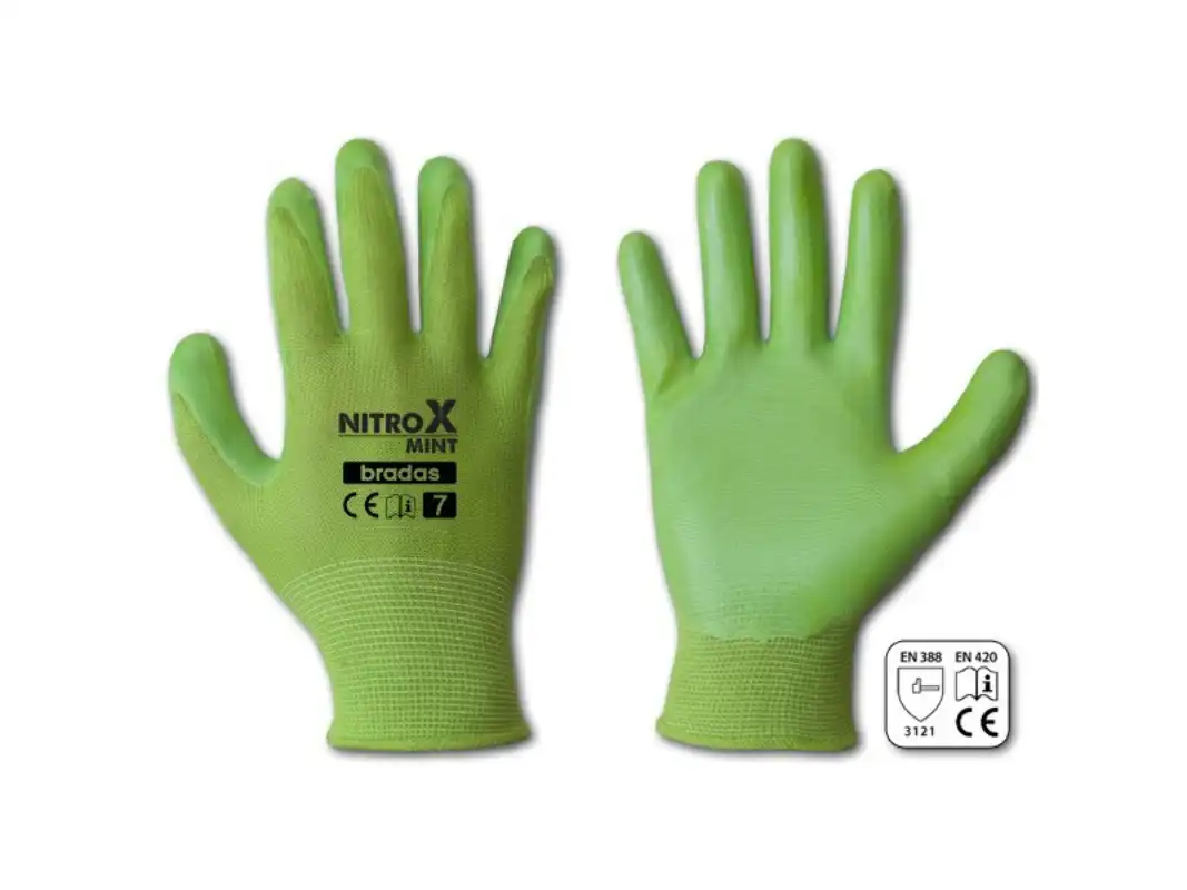 RWNM8 NITROX MINT védőkesztyű, 8-as méret Nitril bevonatú kesztyű sima felülettel. Kötött poliészterből készült – 13-as öltés. Ellenáll a zsíroknak, olajoknak, zsíroknak, szénhidrogéneknek és oldószereknek.
